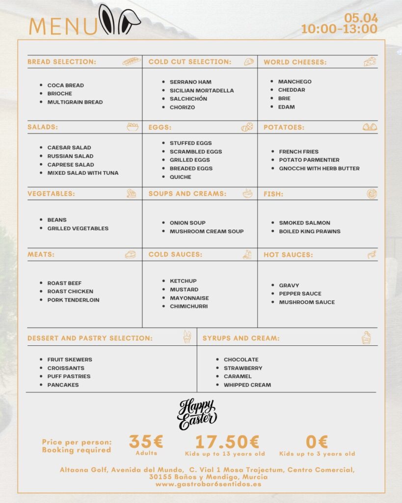 On April 5th we invite you to our Easter Buffet at @gastrobar6sentidos. From 10:00 to 13:00 you can enjoy a special morning in our gastrobar with a wide variety of dishes, choosing exactly what you like and as much as you want.