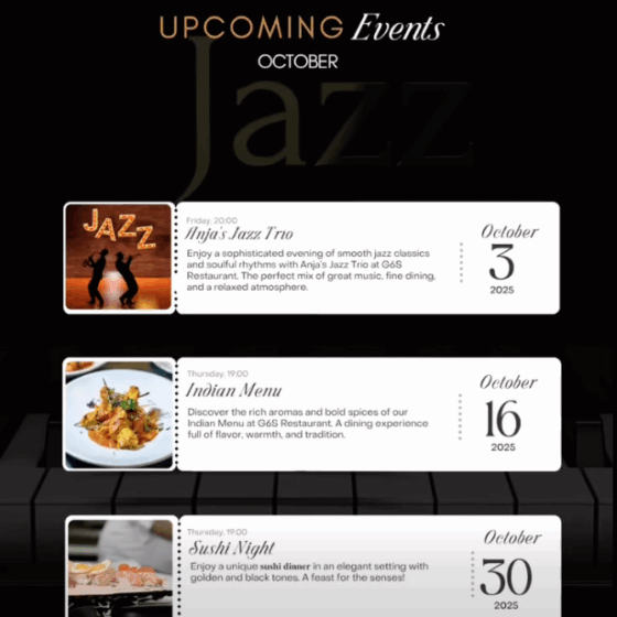 eventos octubre 1, 2025 Octubre con sabor y ritmo en G6S: música, cultura y experiencias inolvidables Hoy es 1 de octubre y eso significa que en @gastrobar6sentidos comenzamos Read More Octubre con sabor y ritmo en G6S: música, cultura y experiencias inolvidables