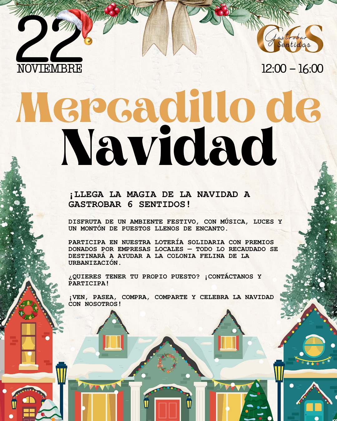 El 22 de noviembre, de 12:00 a 16:00, te esperamos en nuestro Mercadillo de Navidad, un evento lleno de magia, música, luces y mucho encanto. Disfruta de un ambiente festivo con puestos llenos de detalles únicos, participa en nuestra lotería solidaria con premios donados por empresas locales (todo lo recaudado se destinará a ayudar a la colonia felina de la urbanización