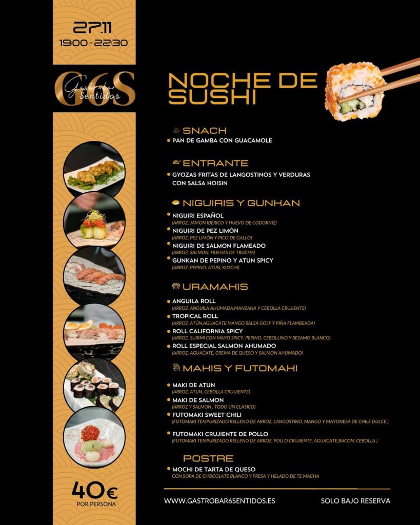 El 27 de noviembre a las 19:00, en @gastrobar6sentidos, regresa una de nuestras veladas más esperadas: Sushi Night. Una cita para disfrutar del sushi recién elaborado, nigiris llenos de sabor y combinaciones que sorprenden desde el primer bocado. Una noche pensada para quienes aman la gastronomía japonesa y los planes con buen ambiente.