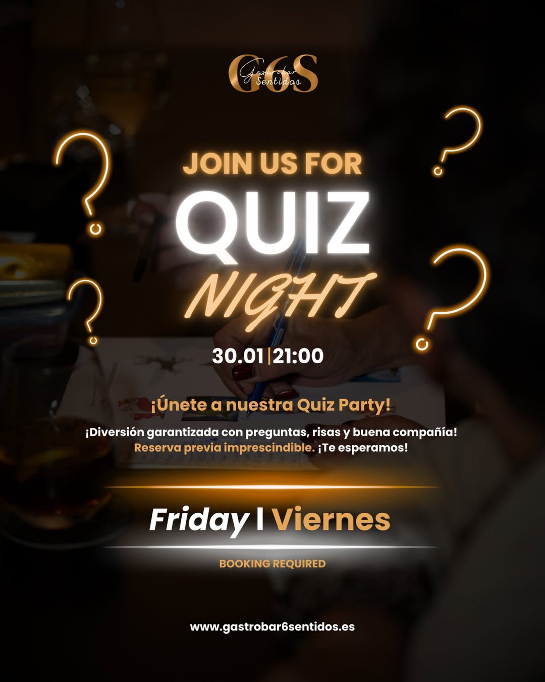 Por fin mañana el 30 de enero a las 21:00, @gastrobar6sentidos se llena de juego y buen ambiente con nuestra Quiz Night. Una noche pensada para disfrutar, retarse y reír: preguntas sorprendentes, emoción en cada ronda y un espíritu competitivo que se vive entre amigos. Todo acompañado de buena comida y una atmósfera perfecta para compartir.